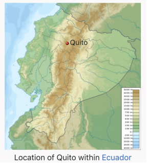 Quito is the capital of Ecuador, the country's most populous city, and at an elevation of 2,850 metres (9,350 ft) above sea level, it is the second-highest official capital city in the world, after La Paz, and the closest to the equator. It is located in the Guayllabamba river basin, on the eastern slopes of Pichincha, an active stratovolcano in the Andes Mountains.