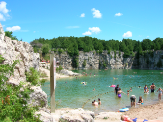 -Located nearby is the "old swimming hole", at the Elora Quarry Conservation Area, a 0.8 hectare (two acre) former limestone quarry encircled by sheer cliffs up to 12 metres (39 ft) high. Elora Quarry did not become a conservation area until 1976, but it was a popular swimming area long before that.